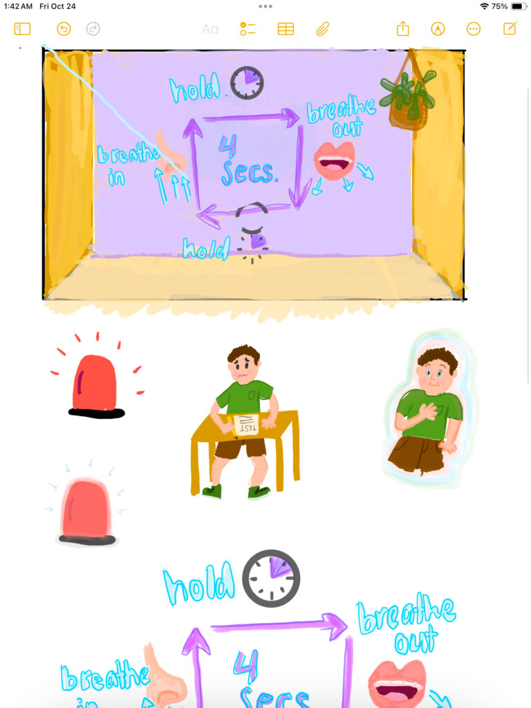 Working independently meant that every stage of the process was mine to navigate, from developing the idea and drawing the characters to narrating, editing, and revising. It was definitely challenging at times, but it also gave me freedom to follow my instincts and make something that feels true to my voice. One of my biggest takeaways was how simplifying the visuals actually made the message stronger. The first version of my “girl at the desk” drawing was full of tiny details that looked nice but made the scene too busy to work with. When I redesigned it into the “boy at the desk” version, everything became easier to animate and more focused — it matched the calm, gentle tone I wanted children to feel.